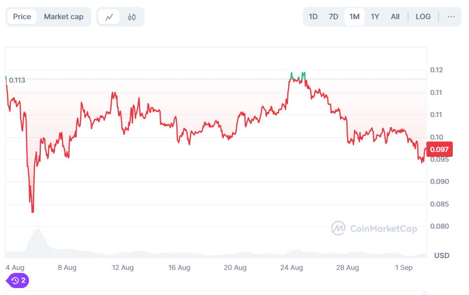 The original meme coin, Dogecoin (DOGE), has been experiencing a downturn in the last 30 days, with a 17.13% decline to DOGE price today of $0.097.