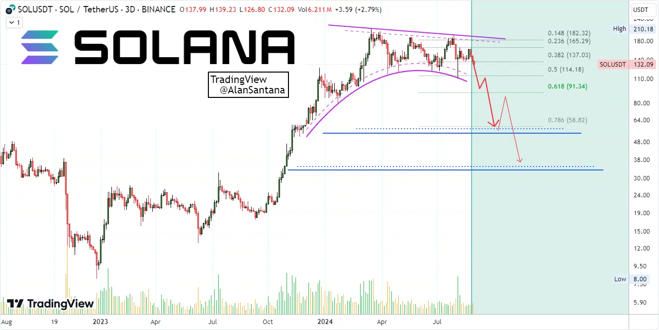 In yet another bearish case for Solana, Alan Santana, a prominent analyst on TradingView, recently revised his forecast for Solana, now predicting a decline to $55. Santana’s analysis highlights key Fibonacci retracement levels, notably the 0.382 level at $137.03 and the 0.786 retracement level at $58.82.