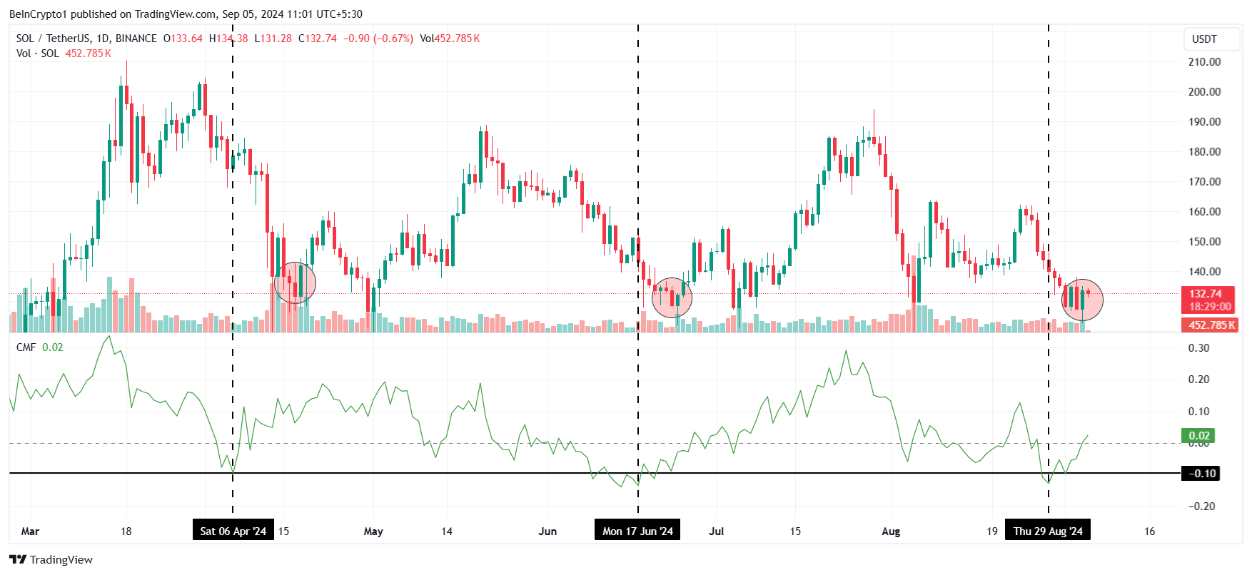 Furthermore, the Chaikin Money Flow (CMF) indicator, which measures the cumulative flow of money into and out of an asset, has established a notable pattern for SOL. Historically, whenever the CMF dips to -10.0, Solana tends to bounce back within seven to ten days. This pattern suggests that recent declines could be temporary, with increased inflows potentially driving the price up in the near future.