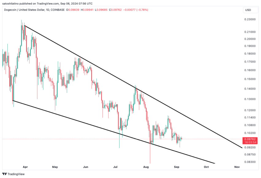 Dogecoin has traded within a falling wedge pattern since March. This pattern is formed when an asset’s price trends between two downward-sloping trend lines. The upper trend line acts as a resistance level, while the lower trend line serves as support.