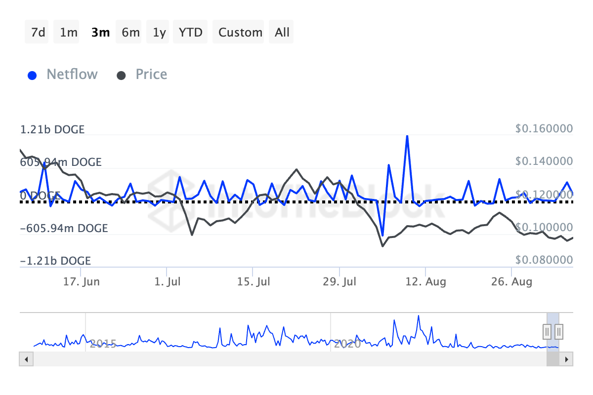 According to data from IntoTheBlock, DOGE’s large holders’ netflow—a metric tracking the difference between coins bought and sold by whales—has dropped by 47% in the last 90 days.