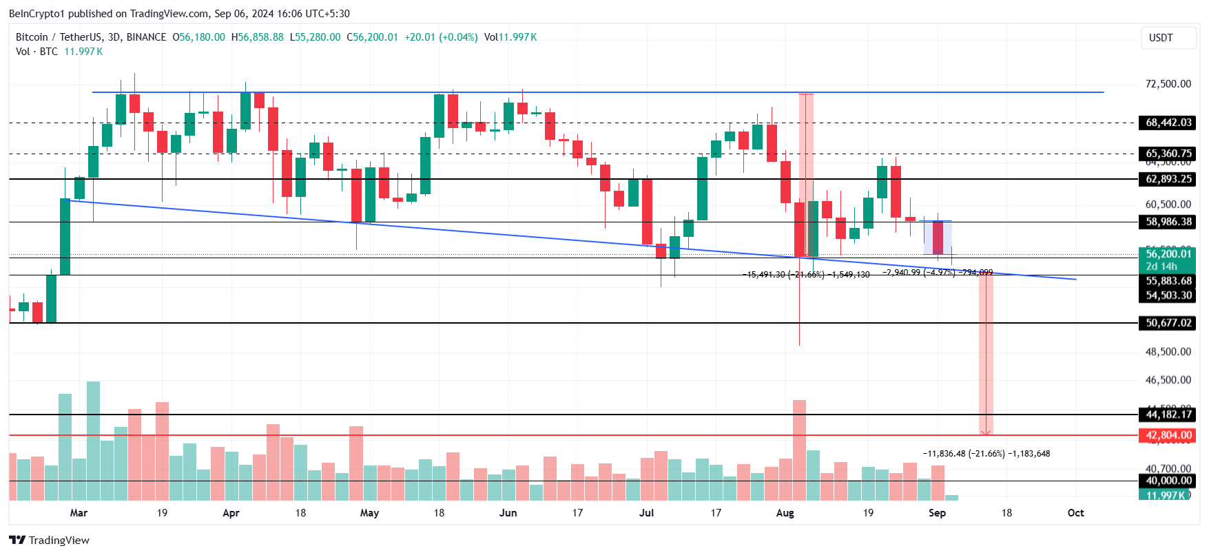 Bitcoin’s price has been stuck in a bearish pattern, forming a right-angled descending broadening wedge. This technical formation projects a potential 21% drop, which would send Bitcoin to $42,804 if the pattern breaks down.