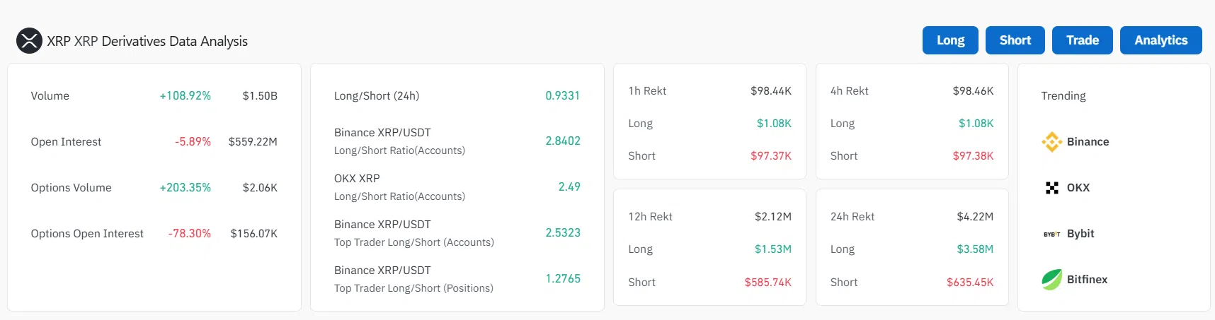 To further bolster this assertion, XRP has recovered by 1.34% this morning, trading for $0.5281, as the global crypto market cap rises 0.74%. Notably, XRP trade volume has also spiked 108% to $1.50 billion as traders re-enter the market following the bloodbath. Data shows there appears to be a resurgence of long positions.