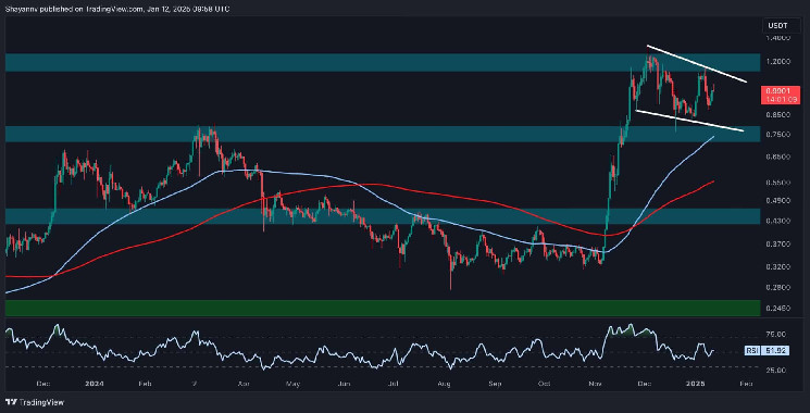 This suggests that the current price action is likely a corrective pullback to retest the $0.8 region. A breakout above the descending wedge could pave the way for a fresh rally, targeting the $1.3 resistance and potentially initiating a mid-term uptrend.