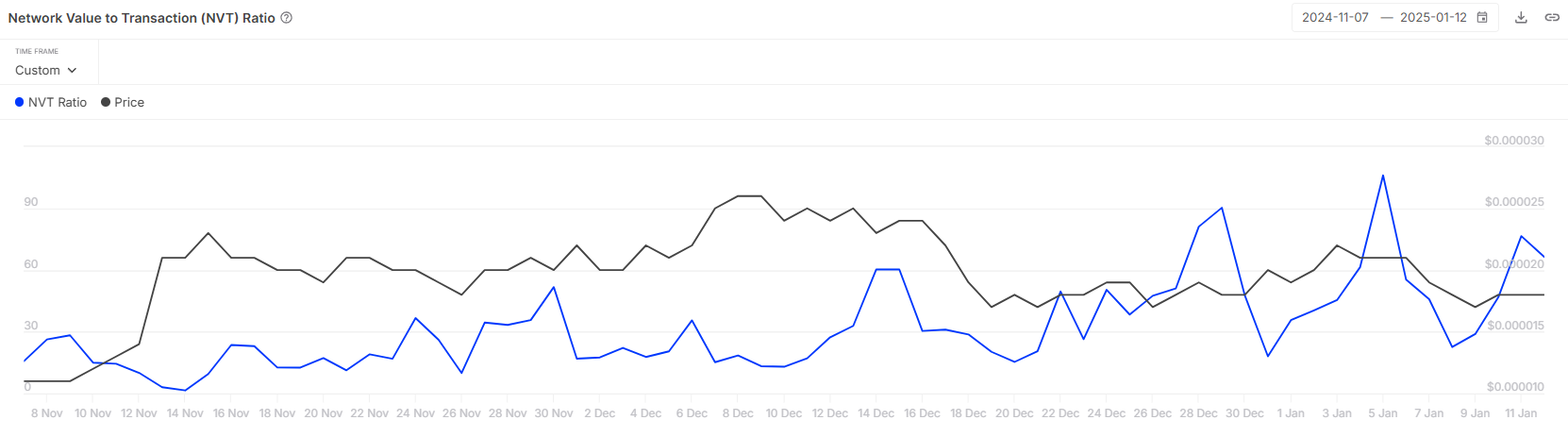 PEPE’s macro momentum is influenced by its Network Value to Transactions (NVT) Ratio, which has spiked recently. A rising NVT Ratio reflects increased network activity relative to transaction activity, often triggering corrective price actions. This trend has contributed to PEPE’s struggle to recover amid broader market bearishness.