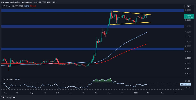 A breakout above this critical threshold could ignite bullish momentum, with buyers targeting the $3 resistance zone.