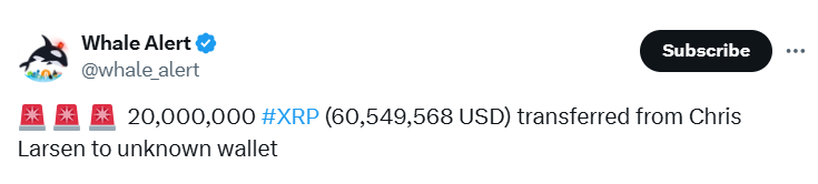 Ripple chairman Chris Larsen transfers 20 million XRP to an unknown wallet address amid the latest XRP price milestone.