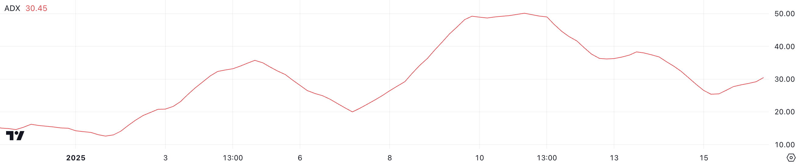 WIF Average Directional Index (ADX) is currently at 30.4, up from 25.3 just one day ago, indicating a strengthening trend. The ADX, now above the 30 level, reflects solid momentum that supports the ongoing uptrend, suggesting that the trend is gaining traction.