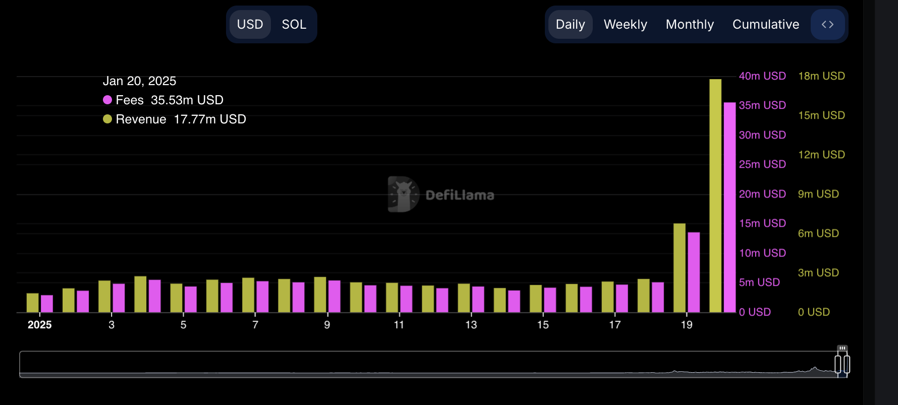 The increased demand for TRUMP and MELANIA has led to a rally in Solana’s user activity in the past few days. As more users and traders flock to the chain to capitalize on the hype surrounding these meme coins, its transaction fees have soared, contributing to a record-breaking revenue high.