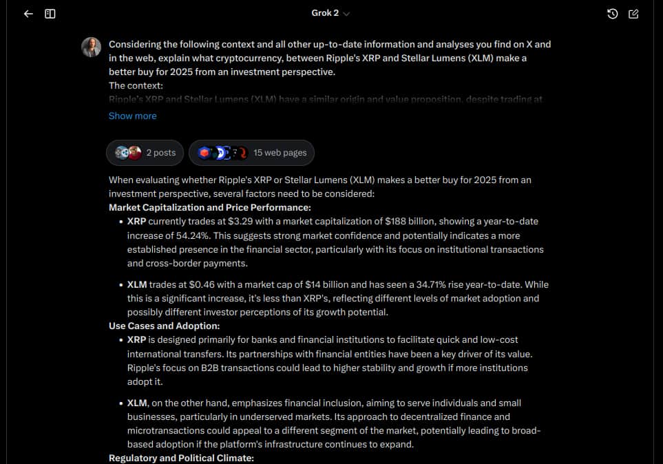 First, Grok’s AI started by analyzing the market cap and year-to-date performance of XRP and XLM, noting XRP’s dominance. The higher market cap and surge suggest stronger “market confidence” and a more “established presence in the financial sector.”