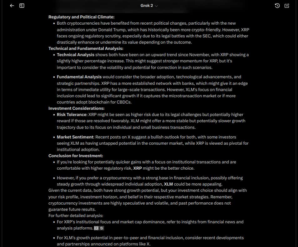 Elon Musk’s designed artificial intelligence continues its evaluation on whether XRP or XLM makes a better buy for 2025. Notably, it navigates “Regulatory and Political Climate,” stating that both cryptocurrencies could benefit from Donald Trump’s crypto-friendly administration.