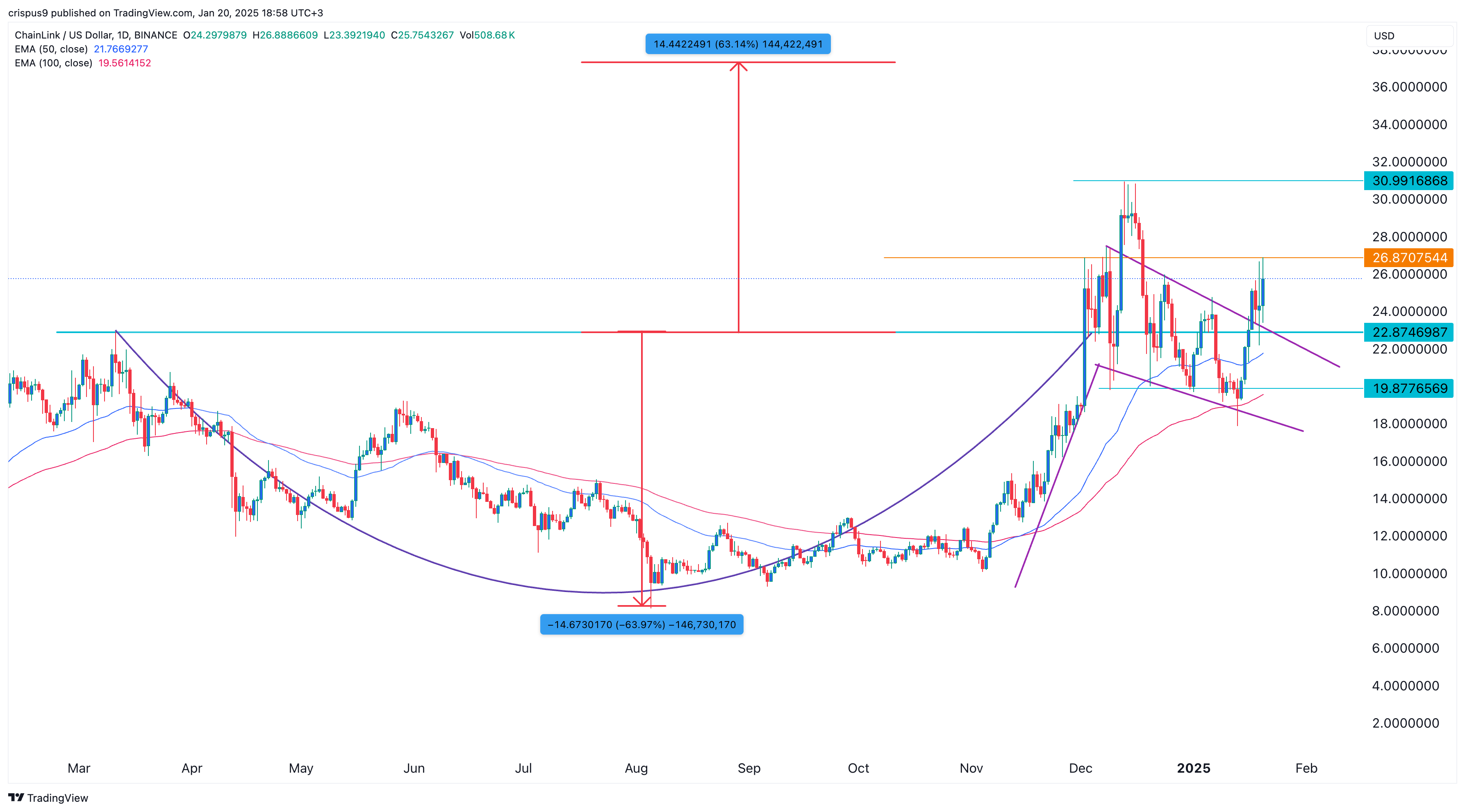 Chainlink price also jumped after Cardano (ADA) founder Charles Hoskinson hinted at a potential collaboration. In a statement, Hoskinson said one of his goals for the year is to forge more partnerships and confirmed securing a meeting with Chainlink.