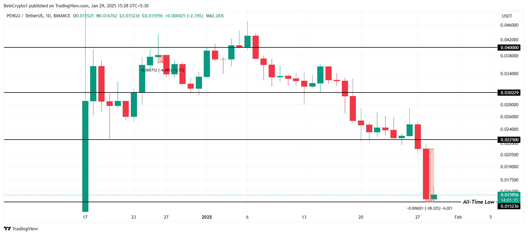 PENGU recorded a steep 28% decline in the past 24 hours, reaching a new all-time low of $0.0152 during intraday trading. This persistent bearish momentum highlights the altcoin’s struggle to find stability, leaving investors cautious about further downside risks in the short term.