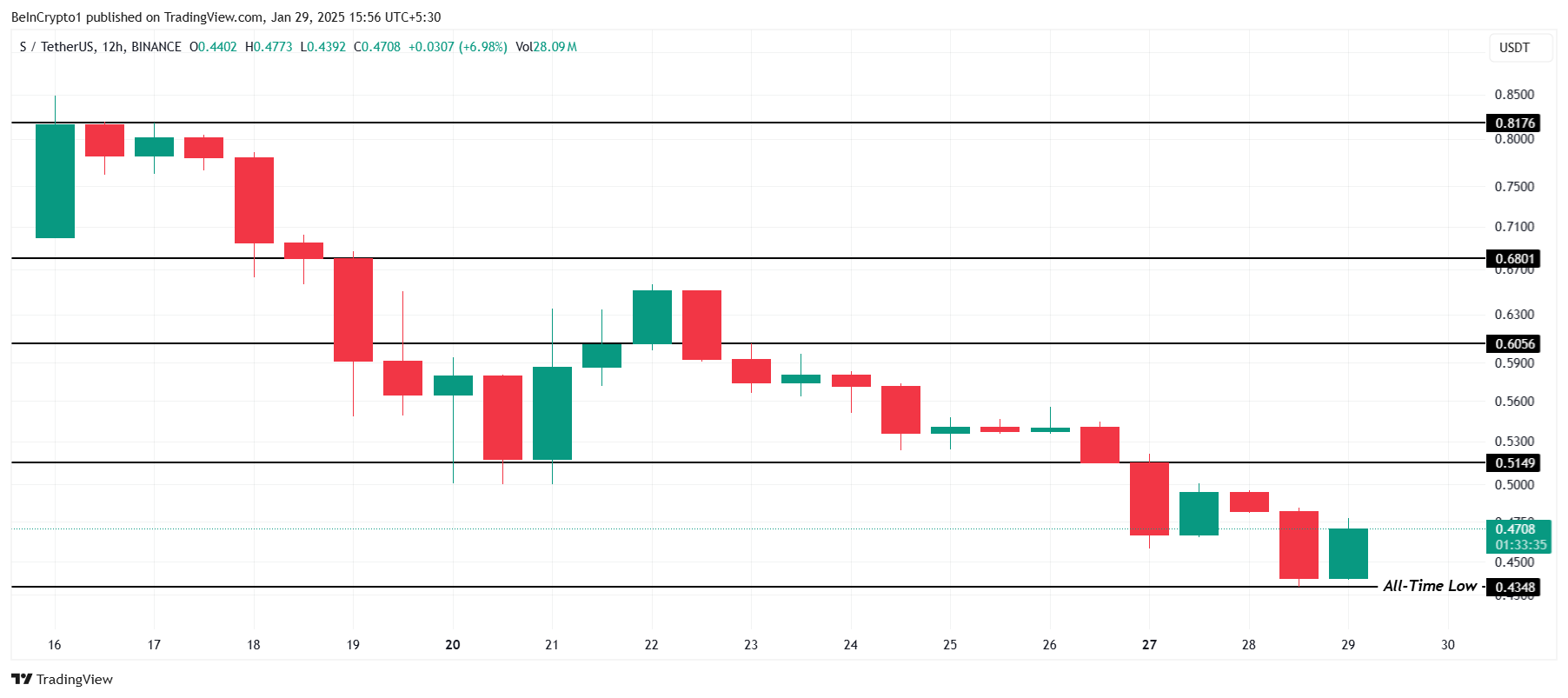 Sonic’s price has extended its week-long downtrend, forming new all-time lows for the past two days. The latest ATL was established at $0.4348, signaling persistent selling pressure. The altcoin’s inability to sustain support levels has contributed to its ongoing decline, raising concerns among investors about further downside risks.