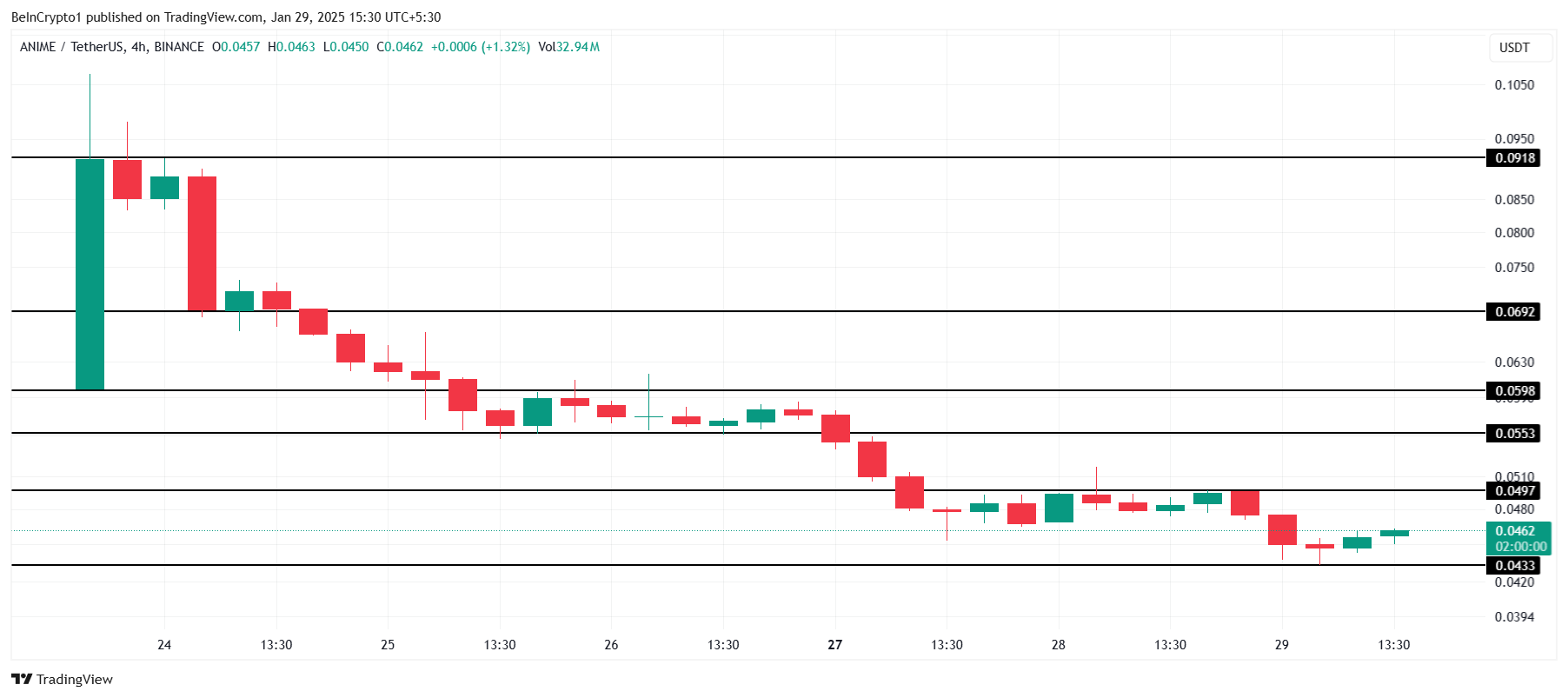 Currently trading at $0.0462, ANIME is attempting to reclaim $0.0553 as support. To achieve this, it must first reach $0.0497. A successful breakout above this level would invalidate the bearish outlook, potentially driving renewed buying interest and signaling the start of a recovery.