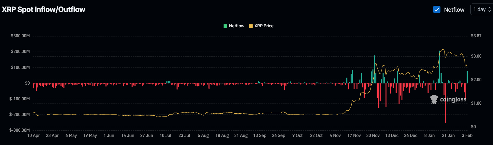 Data from spot inflow/outflow reveals that exchanges have witnessed an inflow of over $80 million worth of XRP in the past 24 hours. This substantial inflow amid this record reversal seems to be a potential sell-off for profit booking and has the potential to cause selling pressure and further price decline.