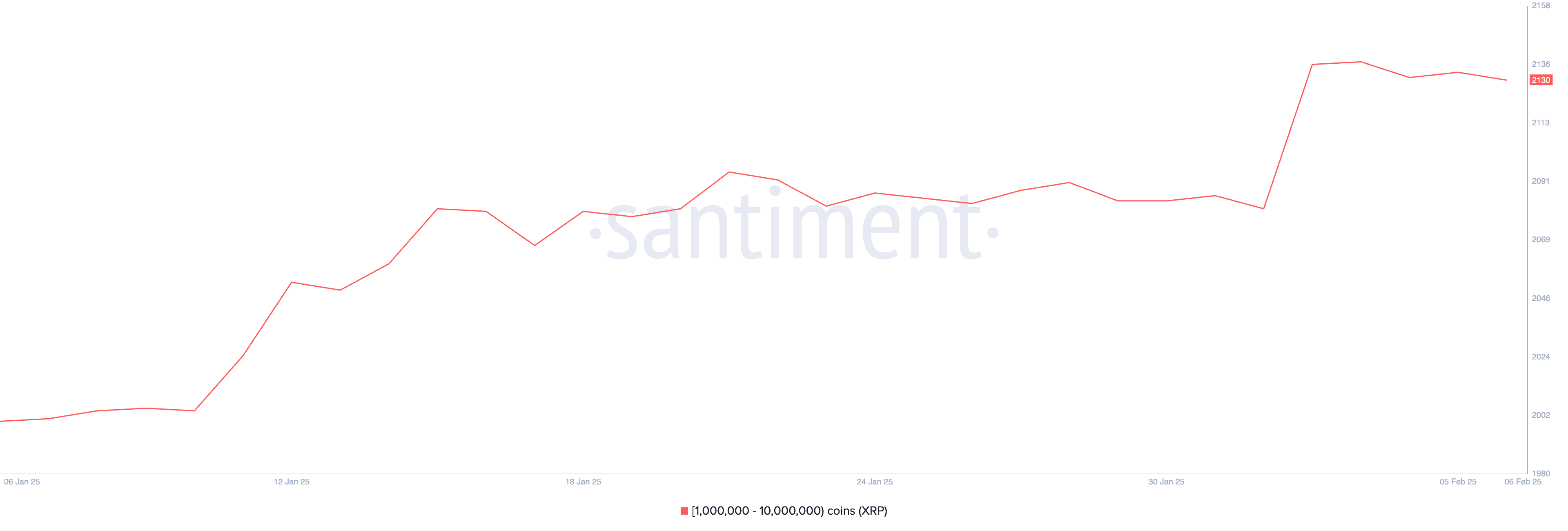 The number of XRP whales – addresses holding between 1,000,000 and 10,000,000 XRP – currently stands at 2,130. This figure surged from 2,081 to 2,136 between February 1 and February 2, indicating a sharp accumulation phase before slowly declining.