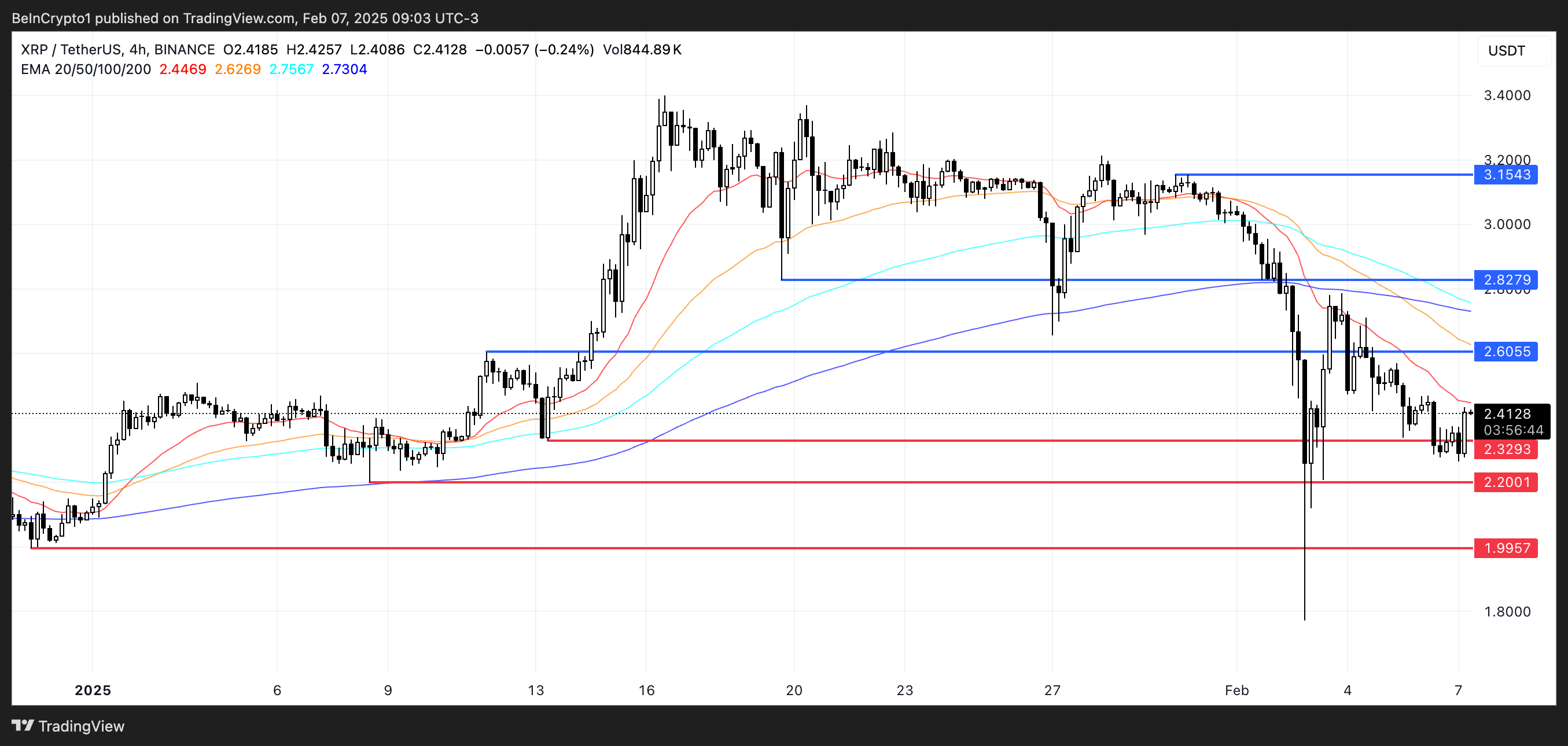 XRP’s Exponential Moving Average (EMA) lines indicate a bearish setup, as a new death cross formed two days ago. This occurs when short-term EMAs cross below long-term EMAs, signaling sustained downward momentum.