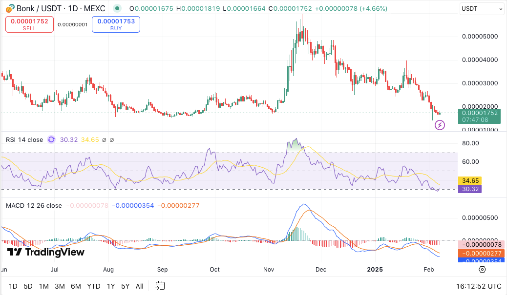 From a technical standpoint, the Relative Strength Index (RSI) is near 30, signaling that BONK is approaching oversold territory. If the RSI starts to climb, a bounce could follow.