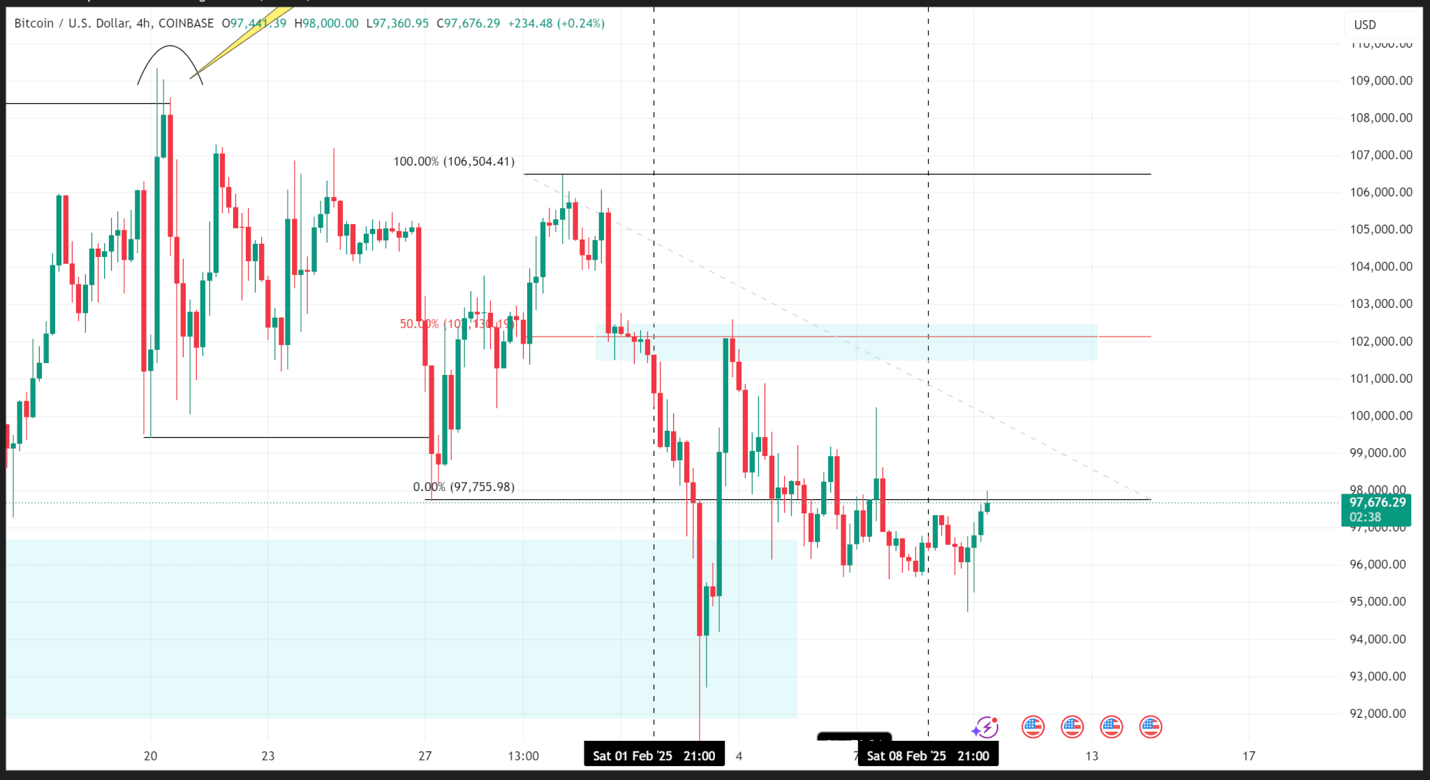 After buying from the demand zone, the price rose to an internal supply zone at $102,000, validated by the 50% Fibonacci level, and sold off that zone to end the week at $96,475.03.
