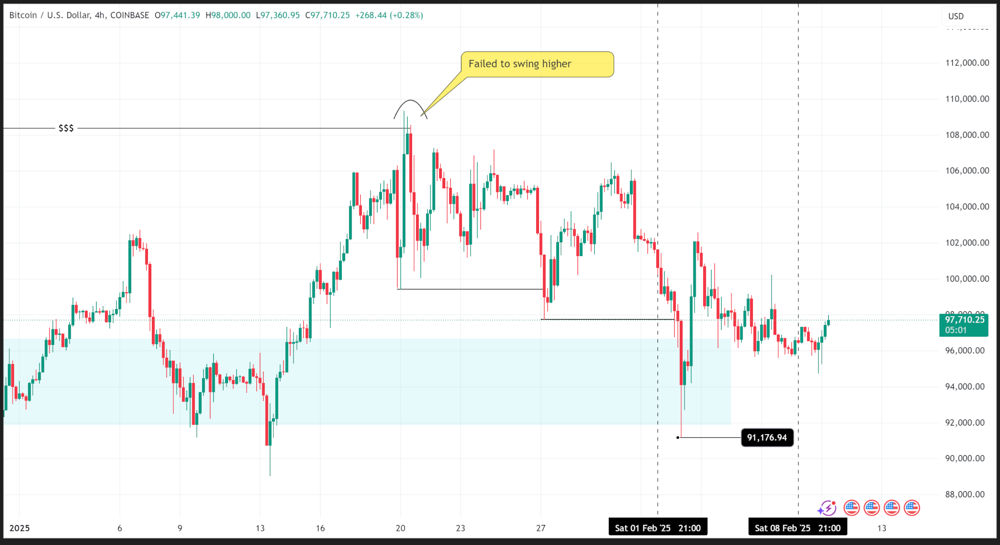 However, the tariffs are a catalyst for faster price declines as price action shows that BTC was already on a decline in its substructure after failing to swing higher than the $108,000 level three weeks ago.