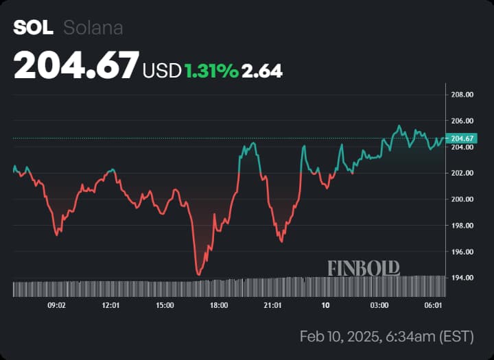 At press time, Solana is trading at $204.67, reflecting a one-day gain of 1.31%. Over the past week, SOL has climbed 3.33%.