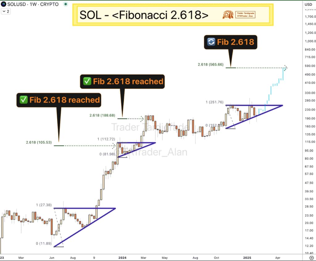 Notably, Trader Tardigrade has highlighted a recurring trend in Solana’s price movements, where each breakout from an ascending triangle formation has consistently reached the Fibonacci 2.618 extension level.