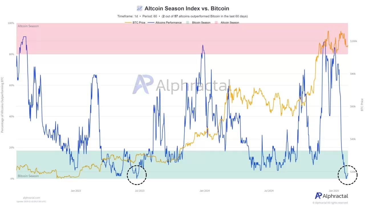 The Altcoin Seasonal Index recently fell to its lowest level since June 2023, signaling a prolonged period of poor altcoin performance over the past 60 days.