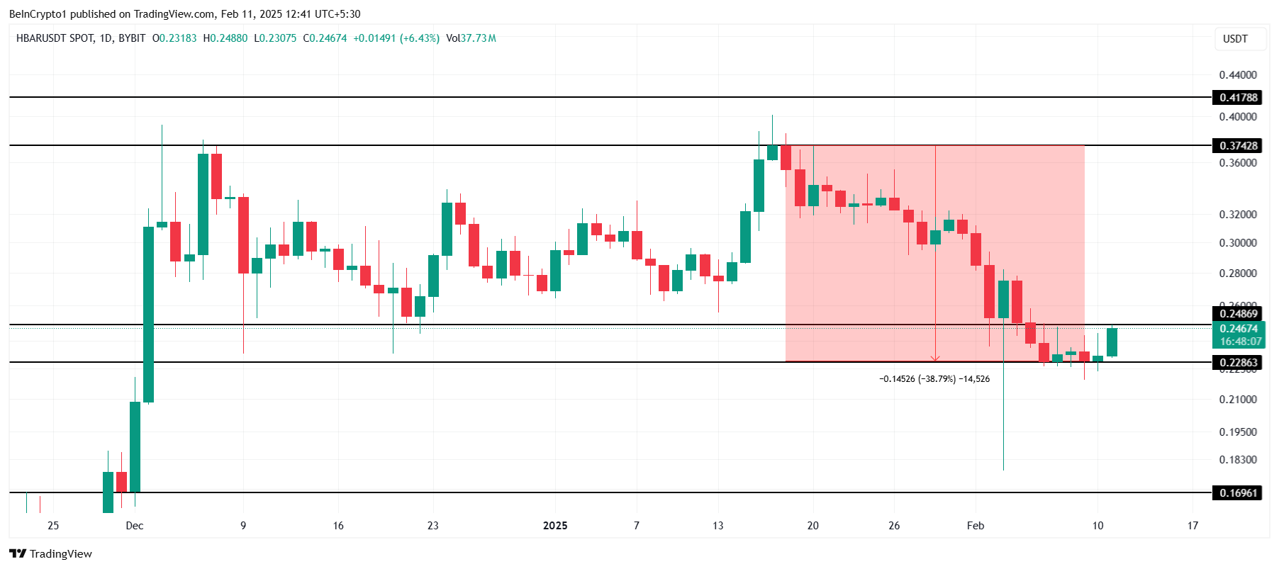 Even if HBAR manages to breach $0.248, it would not be enough to recover the 40% loss the altcoin recently endured. The next significant resistance would be around $0.374, but momentum is not strong enough to push HBAR beyond $0.300 in the near term. The market will likely require more bullish support before HBAR can sustain higher levels.