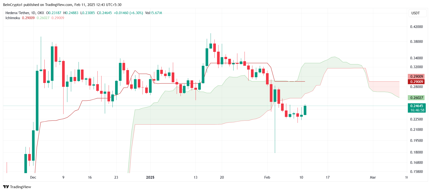 The overall macro momentum of HBAR is showing signs of potential bullishness, as suggested by technical indicators like the Ichimoku Cloud. The indicator’s outlook points toward possible upside movement in the coming weeks. However, the candlesticks are currently situated below the cloud, signaling that any recovery might be delayed.