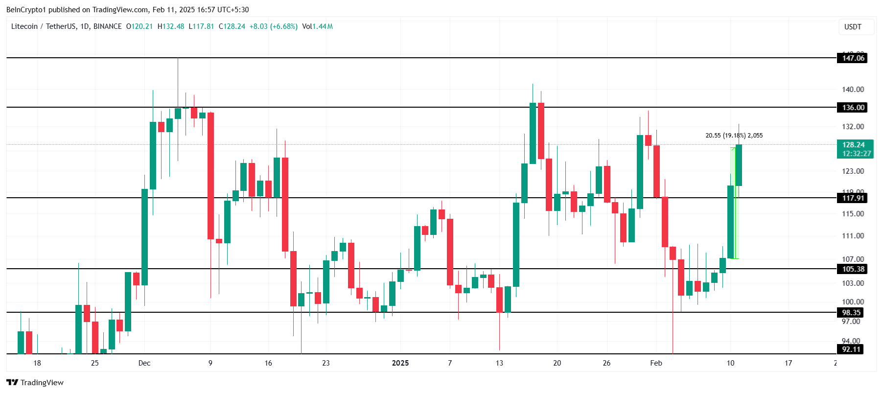 Litecoin has experienced a notable rally over the last 24 hours, surging by 10%. This rally helped the altcoin recover a significant portion of the losses incurred since the end of January.