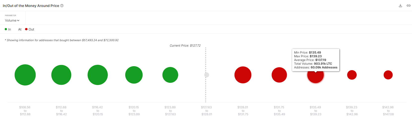 According to the In/Out of the Money Around Price (IOMAP) indicator, there is significant investor interest between $128 and $139. Investors in this range purchased approximately 2.66 million LTC worth over $337 million. Many of these investors have been waiting for a breach of the critical $136 level to bring about profits.