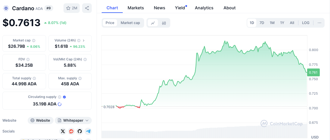 ADA has surged 9.31% in the past 24 hours and is currently trading at $0.7685. The asset saw a strong rally from $0.7028, breaking through multiple resistance levels before peaking above $0.80. After reaching this high, ADA retraced slightly but is holding above key support.