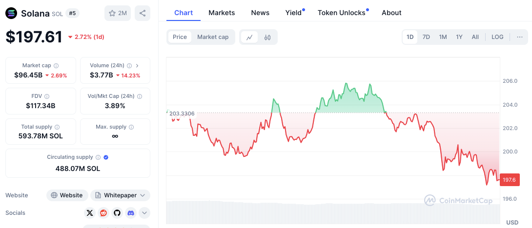 SOL has dropped 2.44% over the past 24 hours, trading at $198.44. The asset initially declined from $203.33 before recovering and surging past $204. However, after reaching its peak, SOL retraced below the $200 level, where it is now trying to stabilize.
