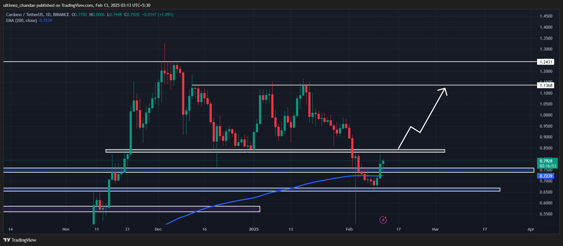 With the ongoing market recovery, ADA has positioned itself above the 200-day Exponential Moving Average (EMA) on the daily time frame, indicating an uptrend.