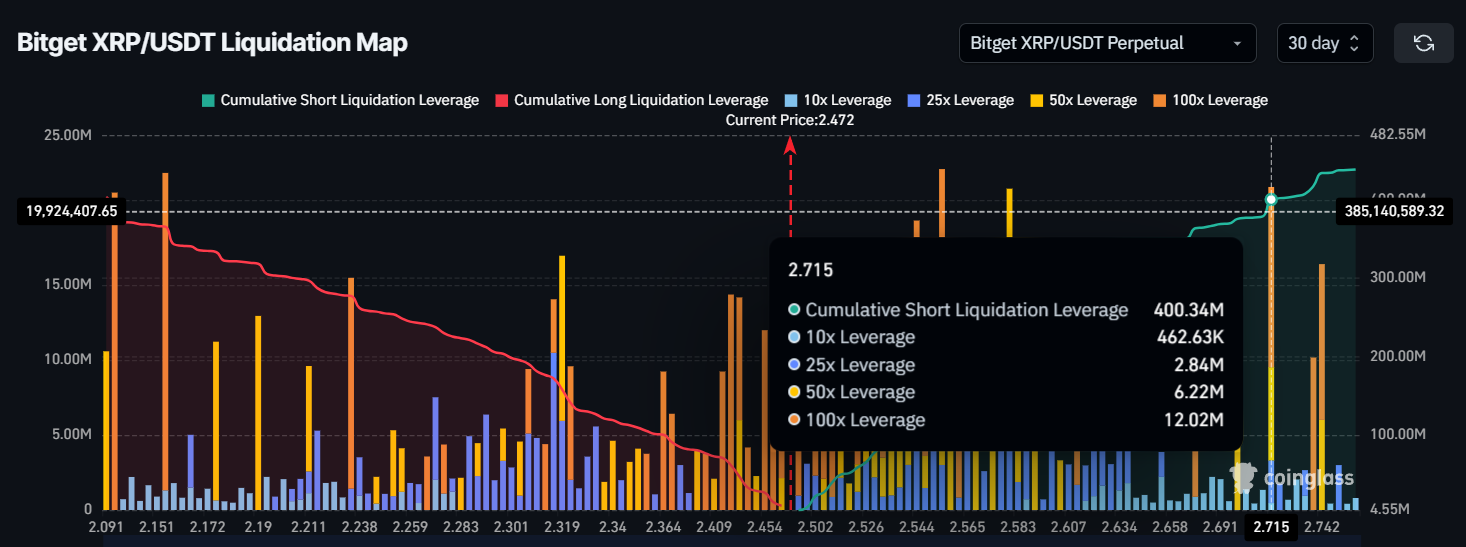 The liquidation map for XRP reveals a concerning scenario for short sellers. Approximately $400 million worth of short contracts are placed between the current price and the $2.70 mark. This significant volume of short positions shows that traders are betting against XRP’s price movement, reflecting a dominant skepticism in the market.