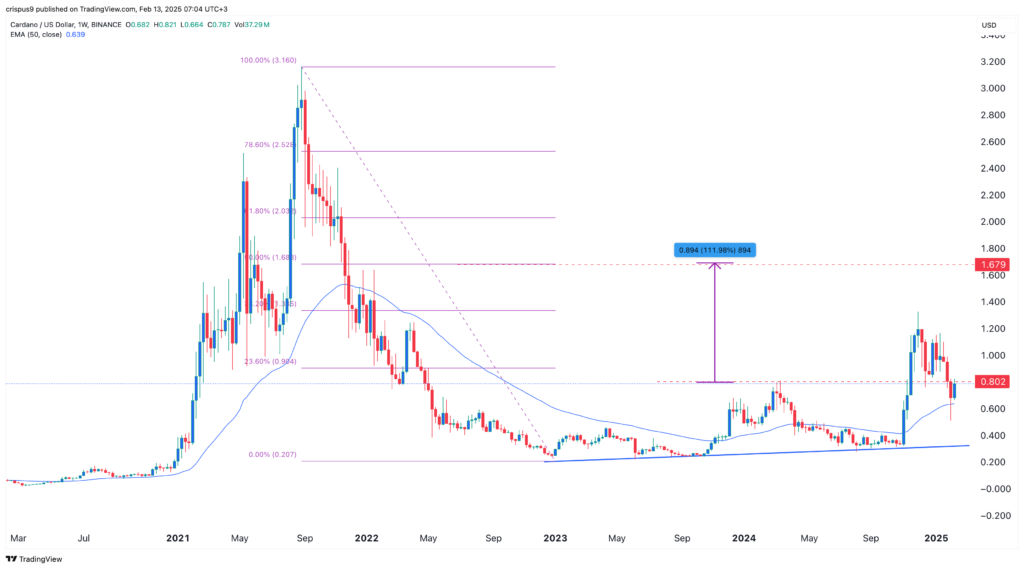 The weekly chart shows that the ADA price has stabilized in the past few days. It has moved to a high of $0.788, a few points above the 50-week moving average and the key resistance point at $0.80, the highest swing in March last year.