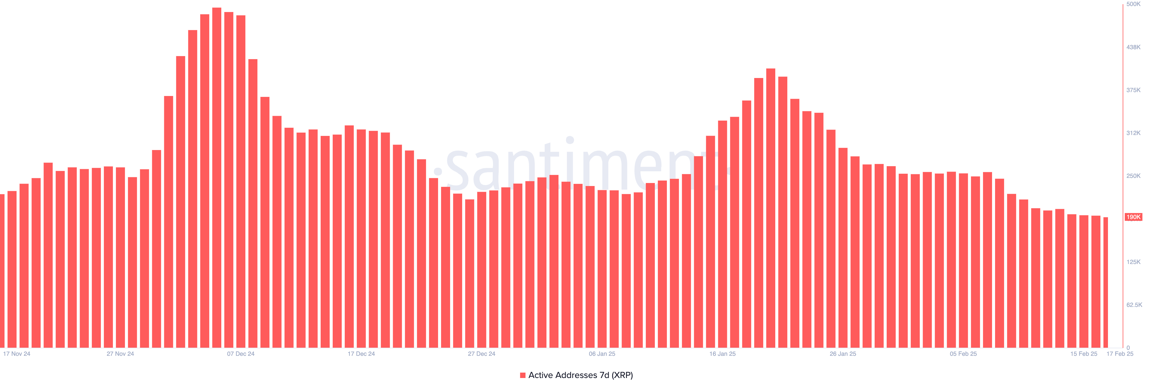 XRP 7-day active addresses have plummeted to 190,470, marking a sharp 53% decline from the 407,000 recorded on January 20. This metric tracks the number of unique addresses involved in transactions over a seven-day period, serving as a key indicator of network activity and overall user engagement.