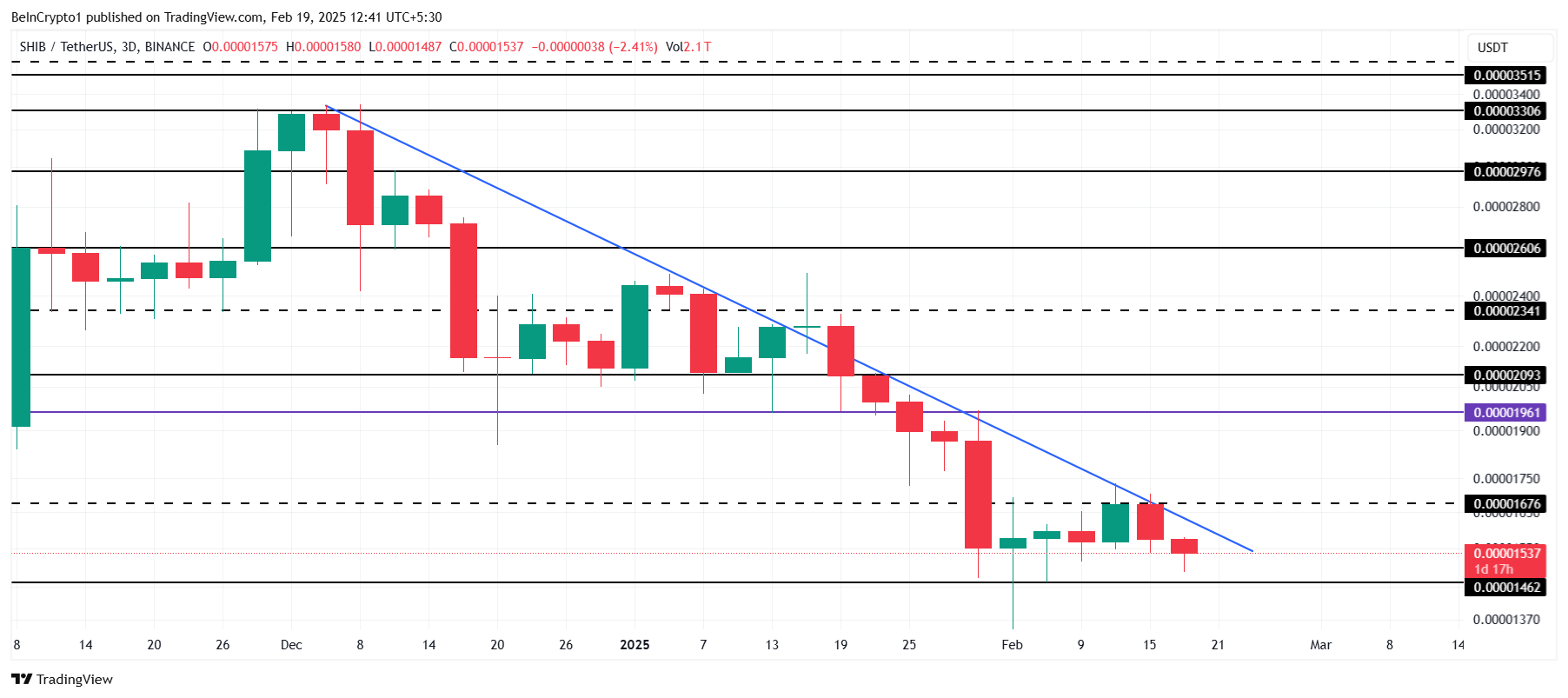 Shiba Inu’s price stands at $0.00001537, currently stuck below the downtrend line after failing to breach the resistance at $0.00001676. This resistance level has proven challenging, and as a result, SHIB has struggled to gain upward momentum. The two-and-a-half-month-long downtrend suggests that further declines may be likely unless there is a significant shift in market conditions.