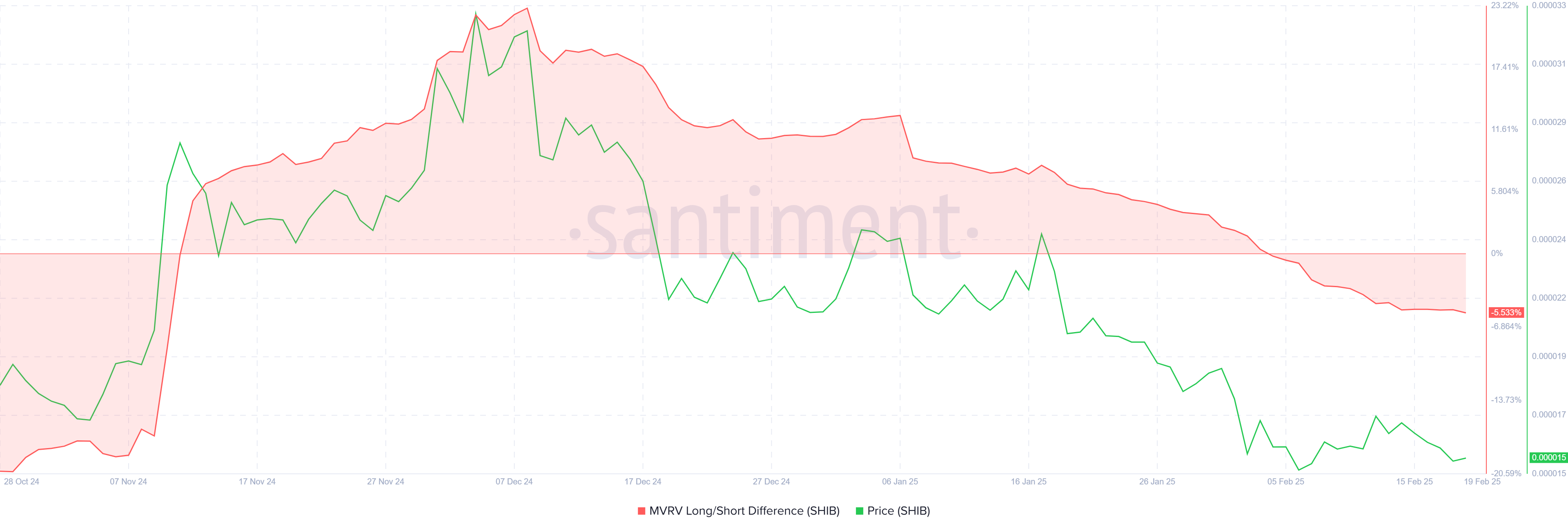 The MVRV Long/Short Difference indicator is currently at -5.5%, signaling that both long-term holders (LTHs) and short-term holders (STHs) are at a standstill in terms of profitability. Neither group is currently experiencing significant gains, which is a troubling sign for Shiba Inu. The lack of profits for both LTHs and STHs signals that investor sentiment may remain muted, further hindering the altcoin’s price recovery.