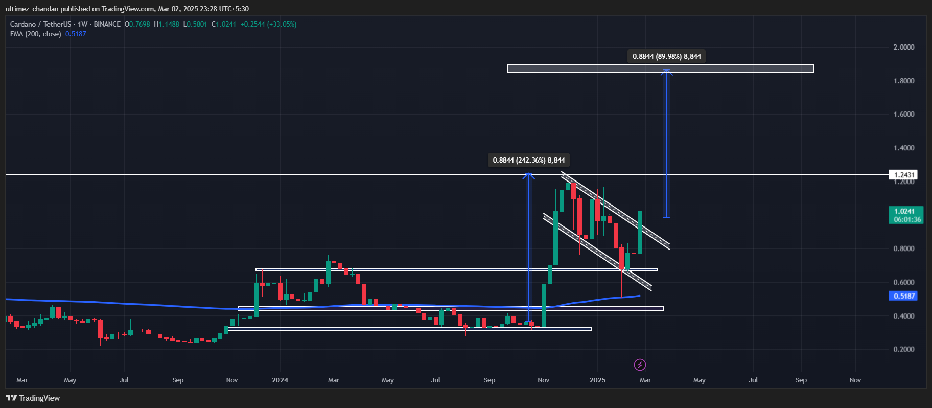 Based on recent price action and historical momentum, if ADA closes a weekly candle above the $1.05 level, there is a strong possibility that it could soar 90% to reach the $1.90 mark in the future.