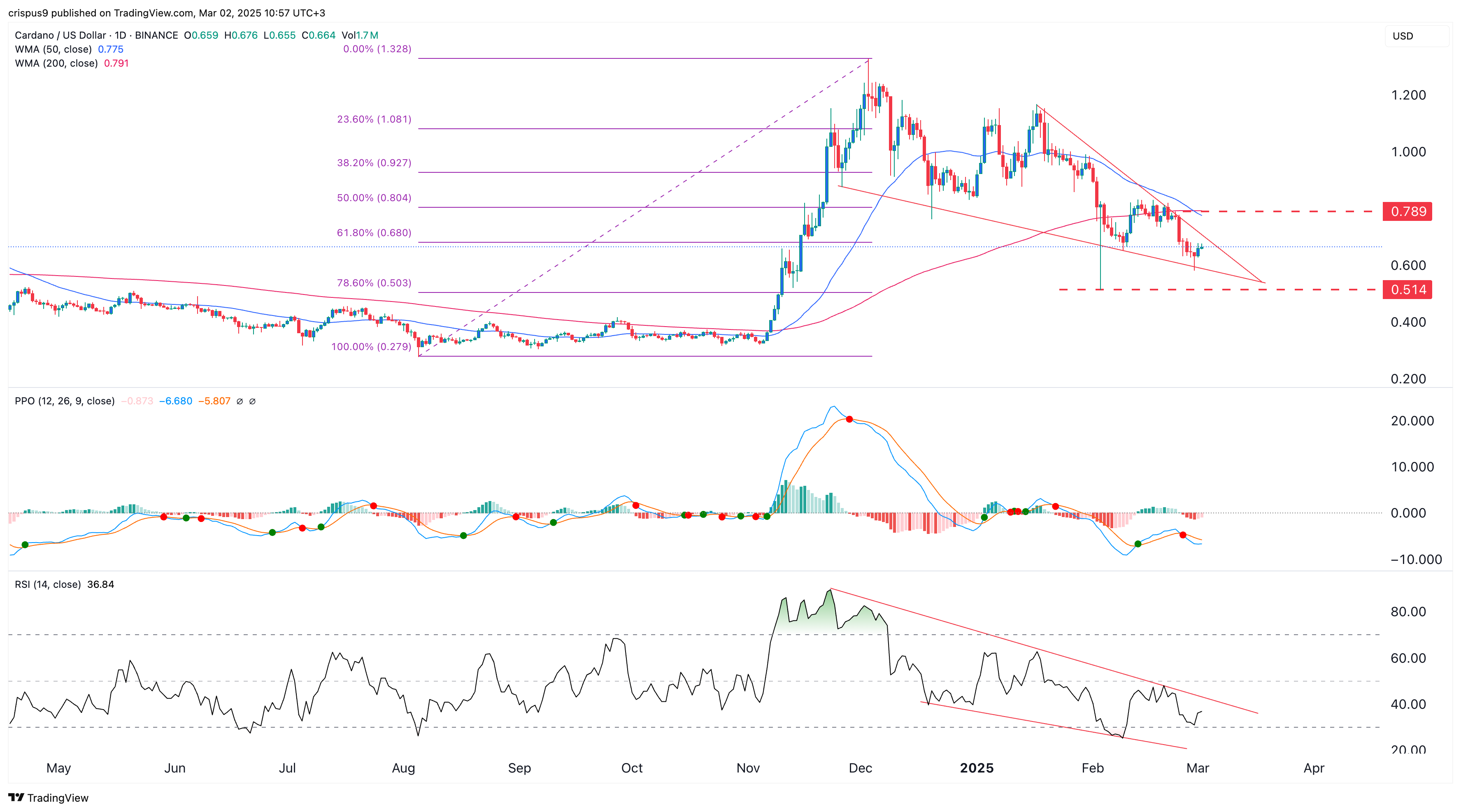 Therefore, Cardano’s outlook is neutral, with a bullish breakout being confirmed if it rises above $0.789, the 50-day moving average, and the 50% retracement point. A drop below the support at $0.515 will point to more downside.