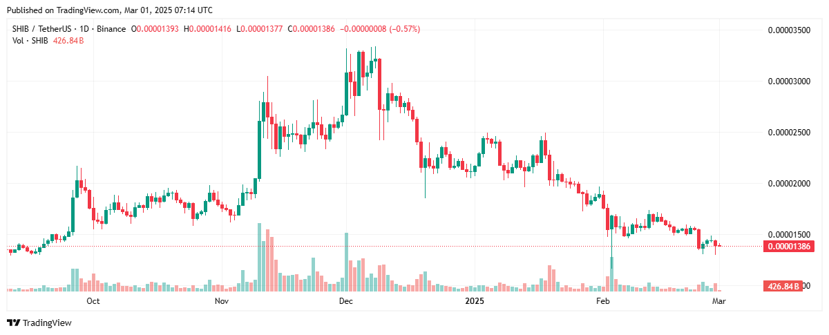 As of March 1, Shiba Inu was trading at $0.00001386, marking a daily surge of 4.55% over the past 24 hours.