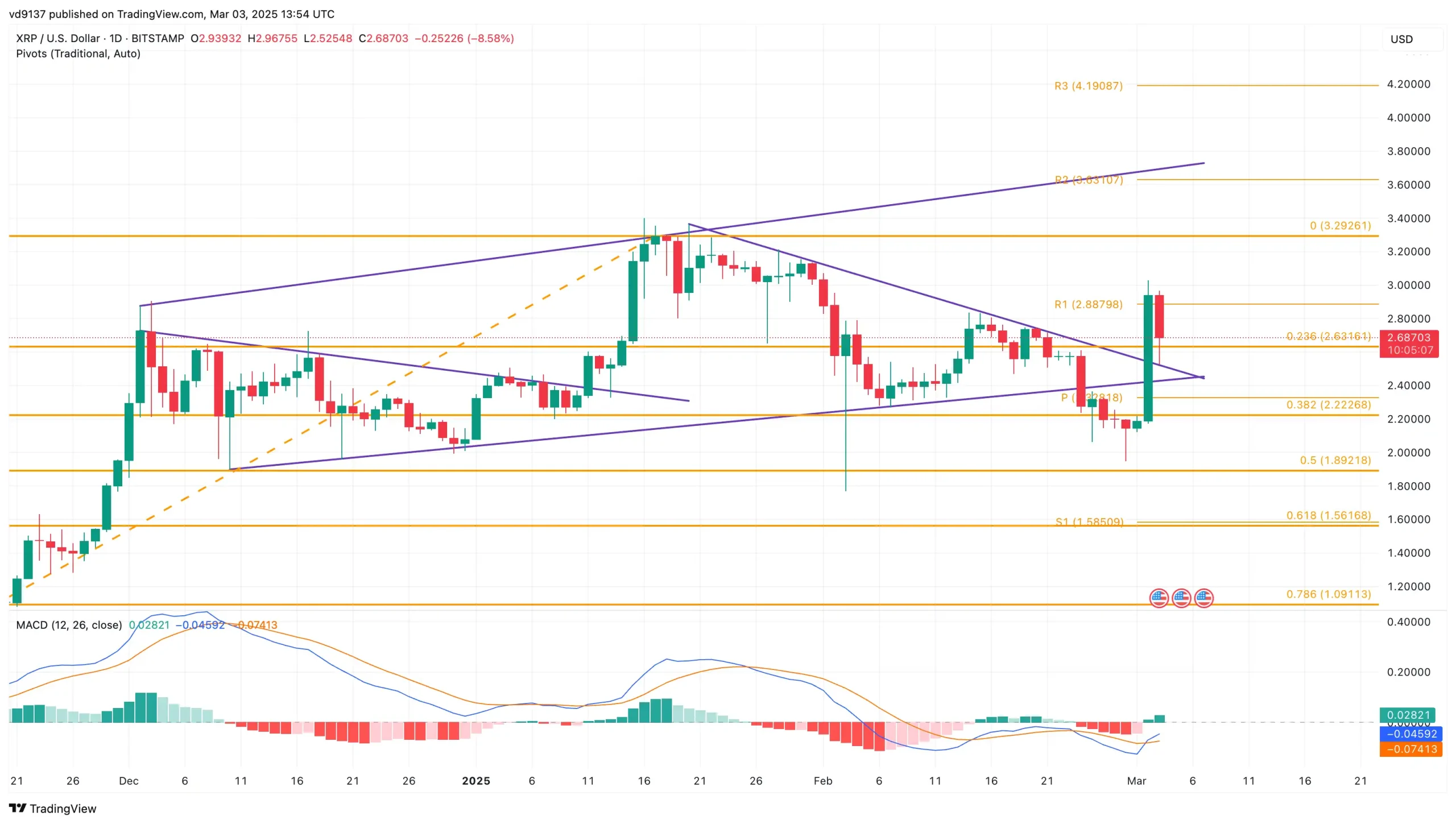 Based on the Fibonacci levels, the uptrend in XRP is expected to reach the $3.29 overhead ceiling. Beyond this, the pivot point standard projects a price target at $3.63, followed by the $4.19 mark. On the flip side, the crucial support level for the altcoin remains at $2.60 and $2.22.