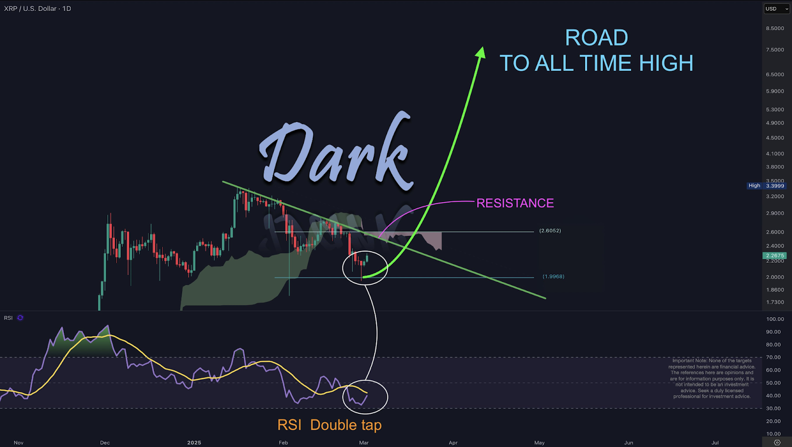 According to market analyst Dark Defender, XRP is preparing to break daily resistance. The asset has bounced off a key support zone. Short-term targets are set at $3.39 and $5.85, while resistance stands at $2.33. Support levels remain at $1.99, with Fibonacci retracement levels marking $1.9681 as a crucial price point.