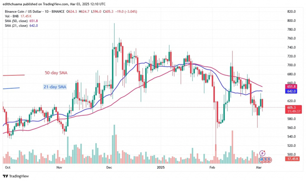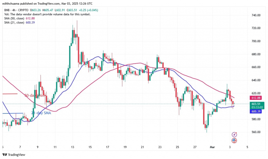 Since February 28, the altcoin has been trading below the moving average lines but above the $560 support. Buyers tried to hold the price above the 21-day SMA on March 2, but failed to do so. The price of the cryptocurrency has fallen and is currently in the middle of the range.