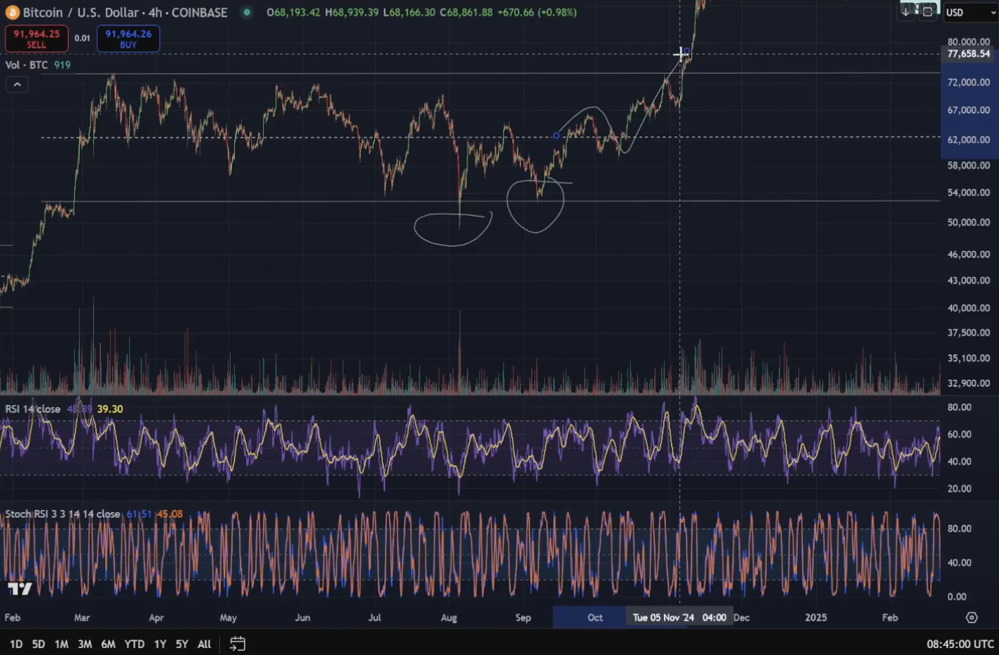 Notably, at the time, BTC first dropped to a low of $49,647 on Aug. 5, 2024, and then recovered. However, this recovery led to another pullback, leading to a higher low of $52,546 on Sept. 4, 2024, within the range of the previous low. After this higher low, BTC rose, pulled back a bit and then skyrocketed.
