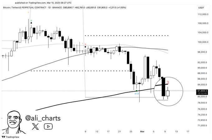 With #Bitcoin$BTC now trading below the 200-day moving average, all eyes are on the TD Sequential indicator’s risk line at $79,820. Holding above this level could be key for a rebound!