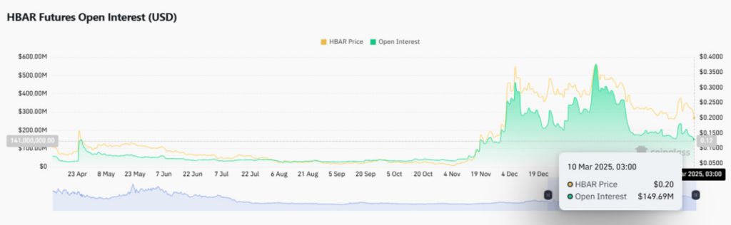 Coinglass data shows HBAR’s open interest has hit yearly lows.