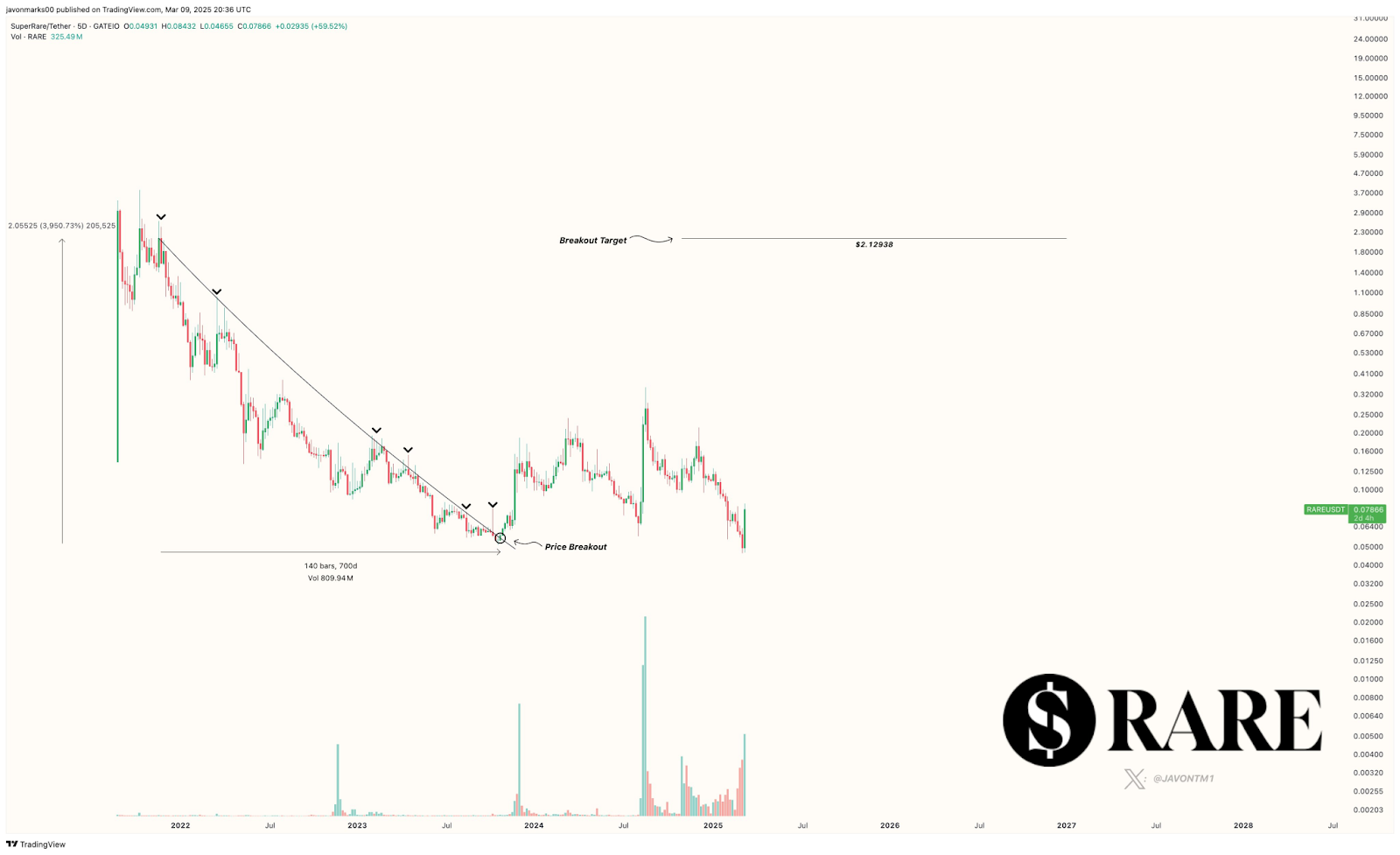 SuperRare (RARE) is showing recovery strength, holding firm after breaking past a long-standing resistance. The cryptocurrency previously followed a downward trend for nearly 700 days. However, it recently broke out, signaling a potential shift toward bullish momentum. The breakout target remains at $2.12938, which would be an impressive 2,472% increase from current levels.